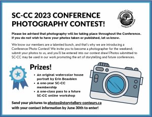 We know our members are a talented bunch, and that’s why we are introducing a Conference Photo Contest! We invite you to become a photographer for the weekend; submit your photos to us, and you’ll be entered into our contest draw! Photos submitted to SC-CC may be used in our work promoting the art of storytelling and future conferences.